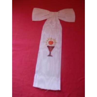 Descritivo: Antiga Fita Sacra De Primeira Comunhão Em Tecido Chamalote, Com Pintura A Mão Do Cálice e Hostia Santa